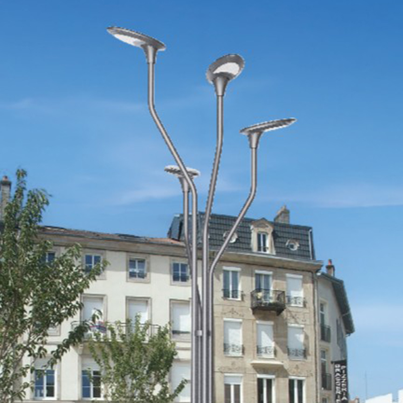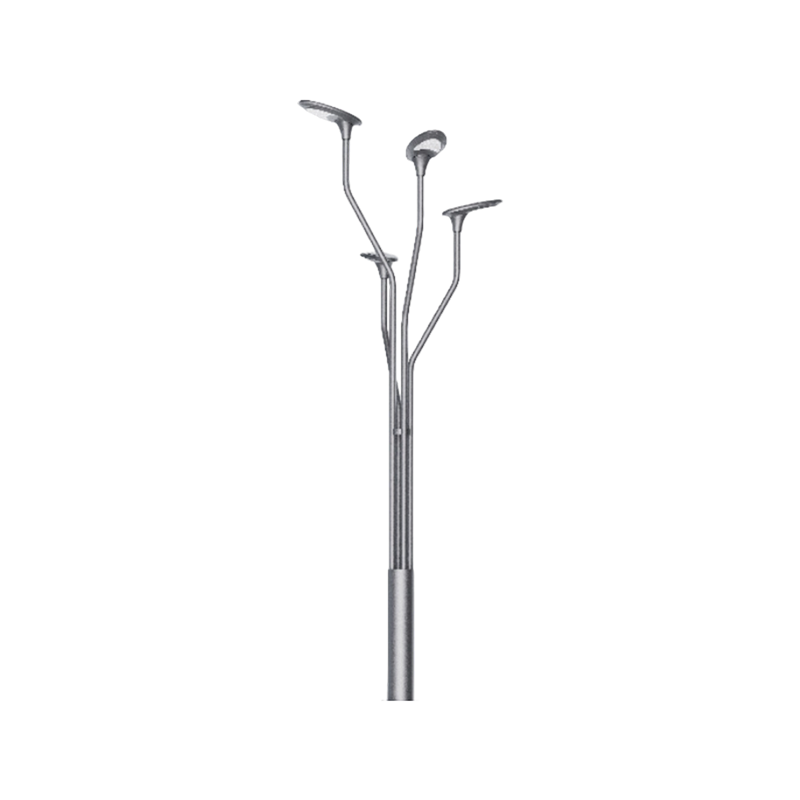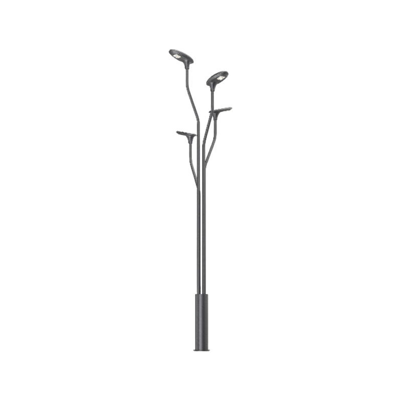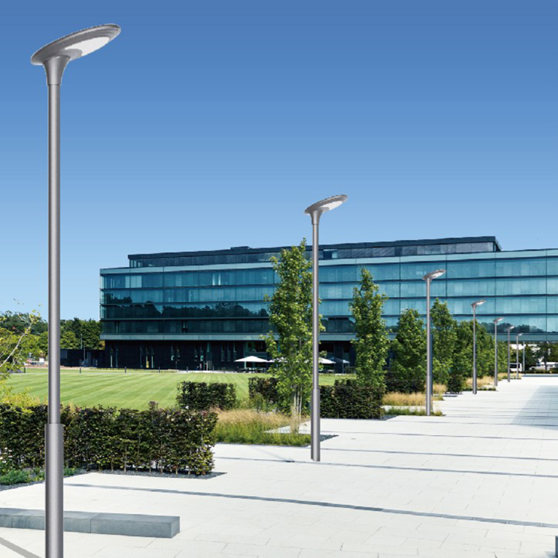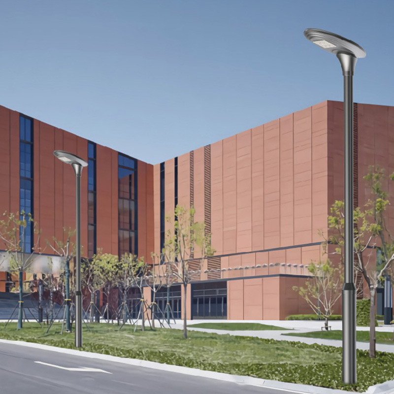 这款庭院灯功率范围较宽,从20W至80W,支持宽电压输入,兼容5V直流至277V交流供电,适用于不同地区的电网标准。结构多为压铸铝材质,配备高透光PC或玻璃罩,支持感应或智能控制模块扩展,常用于公共道路、小区及工业园区。