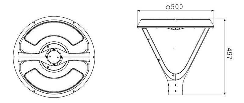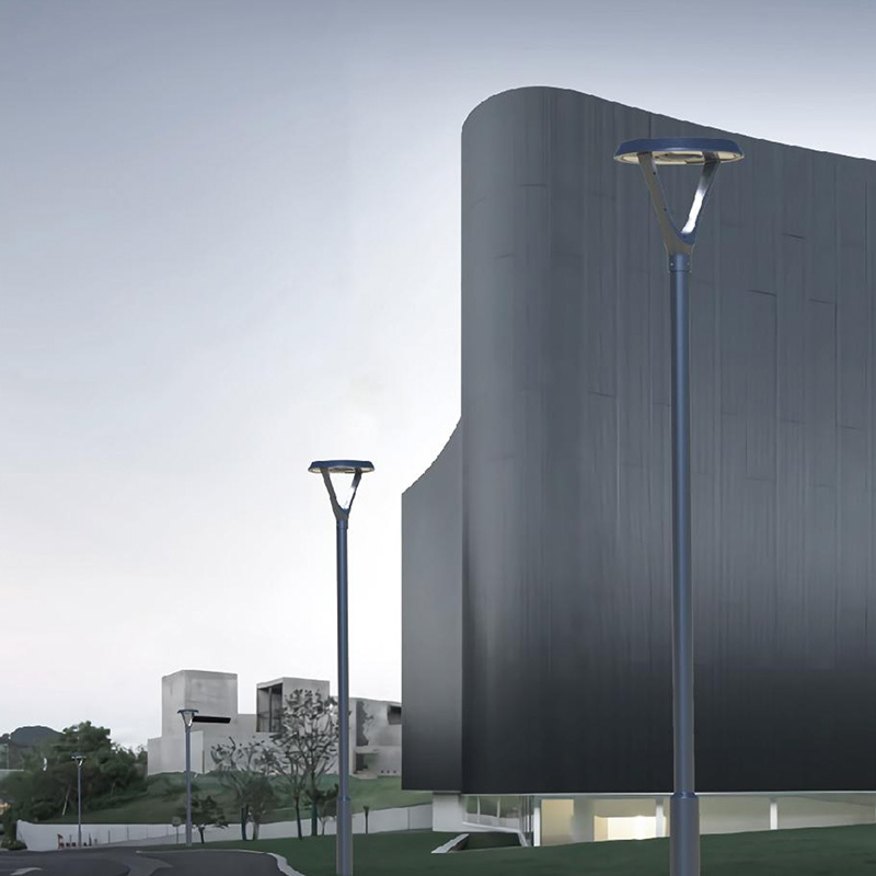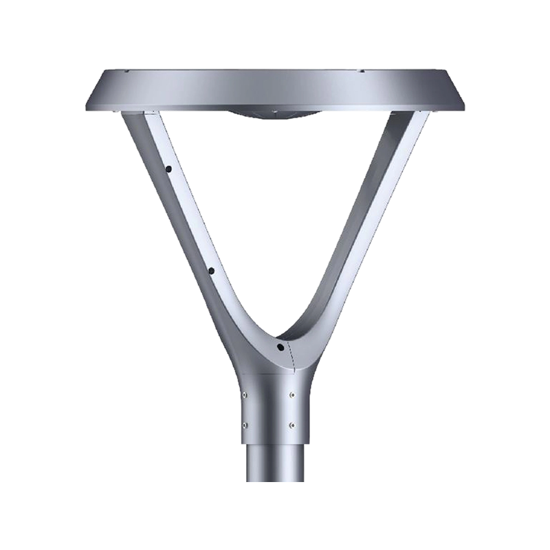 此款为圆盘形市电庭院灯,功率30W-100W,依赖市电供电。采用一体式铝壳散热结构,支持多种安装方式(吊杆、壁挂、落地),光通量根据功率不同可达3000-10000LM,适用于大型庭院、停车场及公共开放空间的主照明。