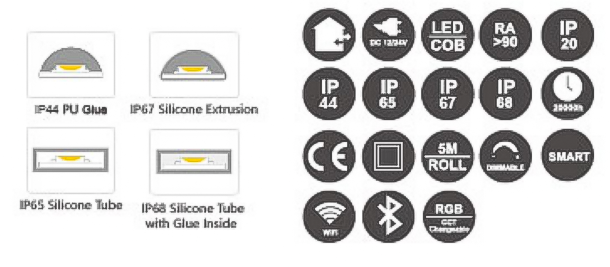 功率范围10W-14W,单位光通量约100-140lm/W,采用高密度LED布局(如120灯/米)。具备连续无频闪特性,可选硅胶套管防护(IP67等级)或裸板设计(IP20)。支持CCT双色温调节或RGBW混光,需配合控制器使用。适用于广告灯箱、建筑轮廓照明及家居装饰照明。