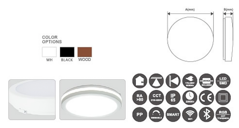 该系列吸顶灯包含15W、24W和36W三种功率型号,可满足从小型卫生间到中型卧室等多种场景的照明需求。灯具设计简约,主体为塑料,配备乳白PC扩散罩。光通量范围从1500lm至3500lm以上,色温提供暖黄光(3000K)和正白光(6000K)可选,显色指数大于80。采用直接吸顶安装方式,安装流程简便,适合批量安装于公寓、酒店及住宅项目。