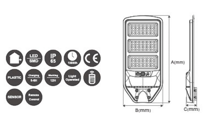 40W至200W功率范围的LED太阳能灯,采用黑色外观设计。其光通量输出介于600LM至2700LM之间,可根据实际照明需求选择相应型号。灯具使用太阳能供电,集成高效光伏板与蓄电池系统,能够在日光条件下自动充电,并于夜间或低光照环境下自动启亮。