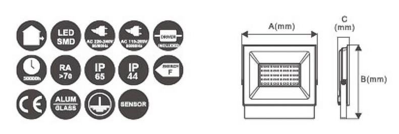 长方形LED泛光灯,功率范围覆盖7.5W至200W,光通量输出介于600lm至16000lm之间,适用于多种户外及工业照明场景。灯具采用黑色边框设计,结构简洁,适配多种安装环境。