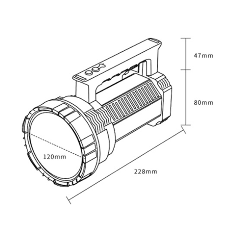 大光斑锂电探照灯采用228mm大口径光学系统,提供宽广均匀的照明范围,适用于中远距离照明场景。内置6600毫安时锂离子电池,支持长时间持续工作,具备Type-C充电接口,充电效率较高。外壳采用工程级ABS材料与防水结构设计,适应多种户外环境条件。灯体配备散热鳍片结构,有助于维持长时间使用时的光效稳定性。操作部分设有多档调光模式,用户可根据实际需求调节亮度。整体结构兼顾便携性与功能性,适用于巡査、救援、工地作业等专业场合。